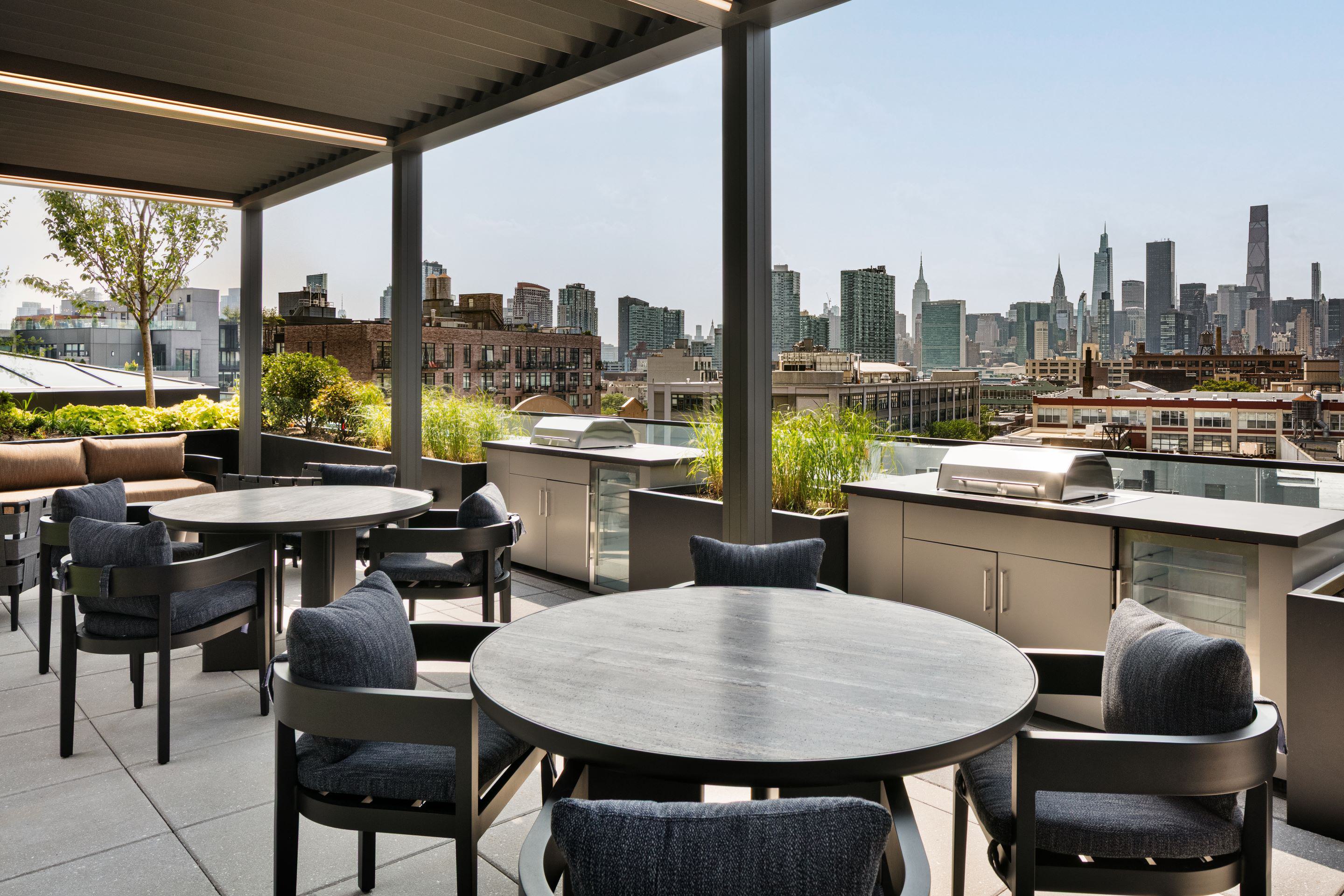 - Amenity terrace on the 66th floor with outdoor grills, seating, and skyline views of Manhattan
