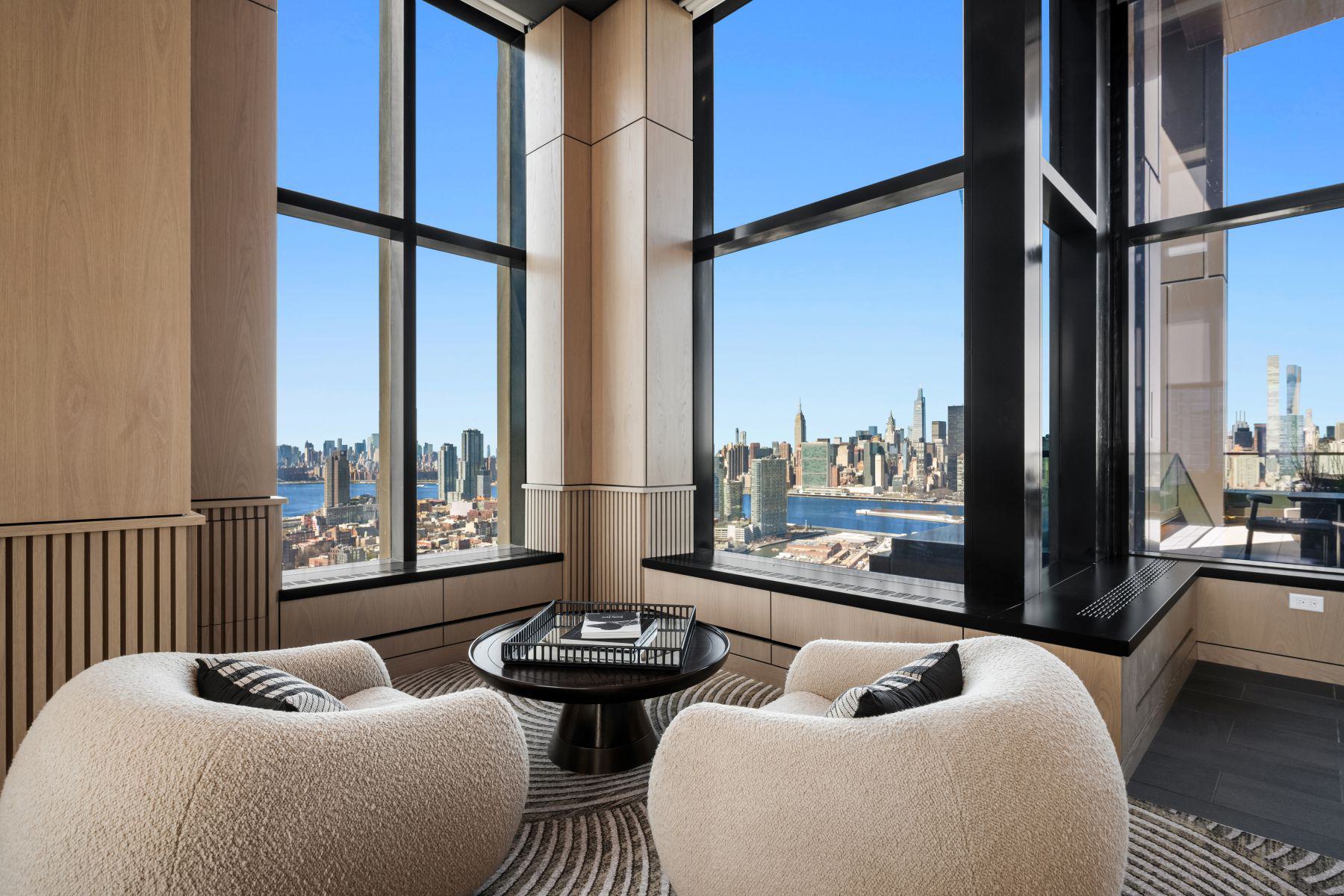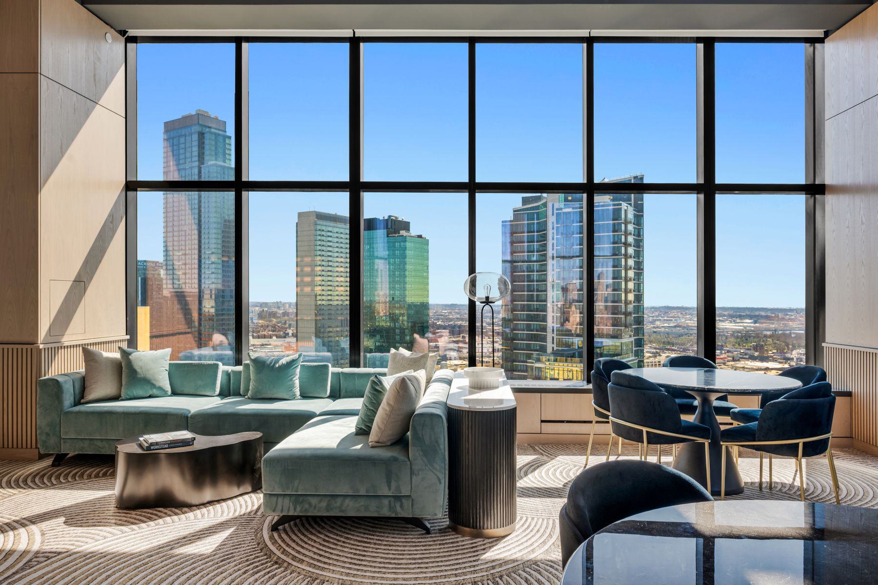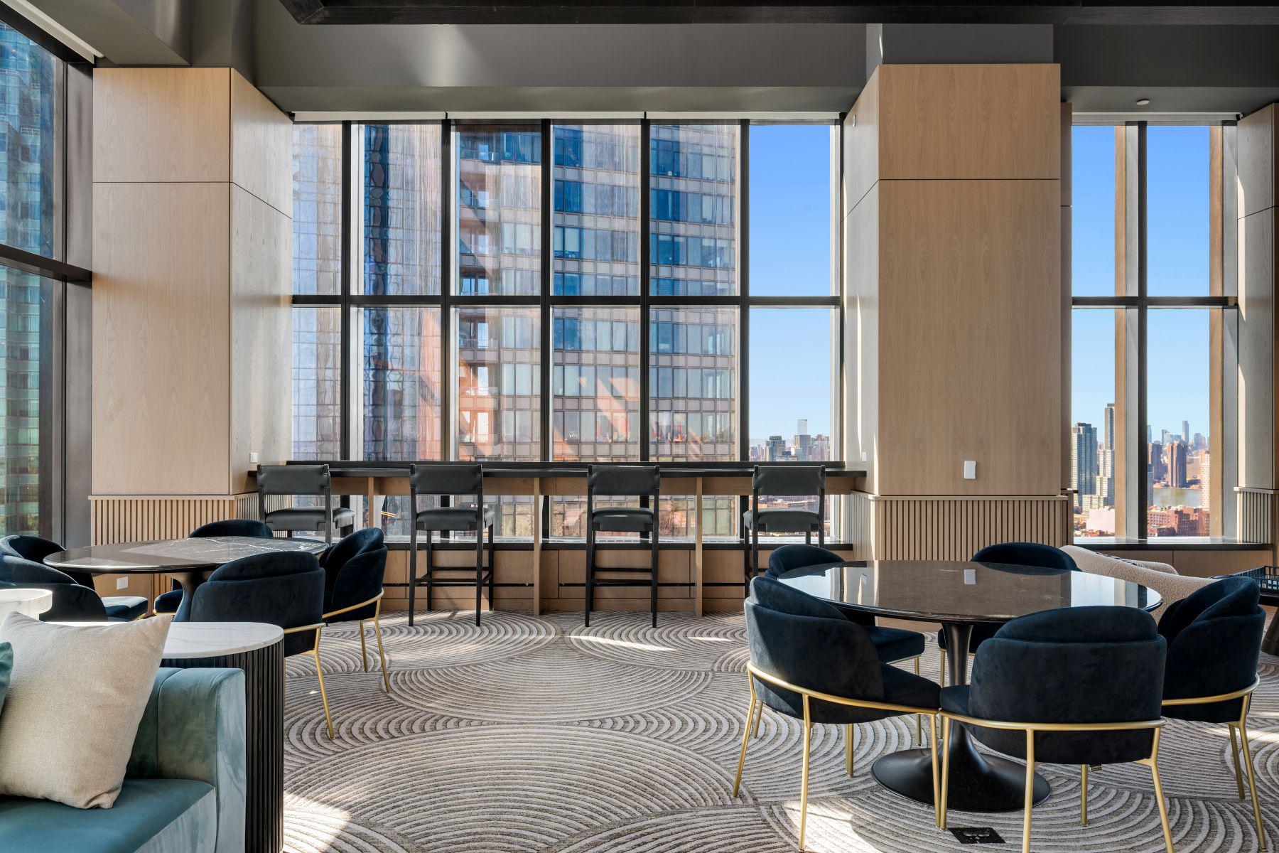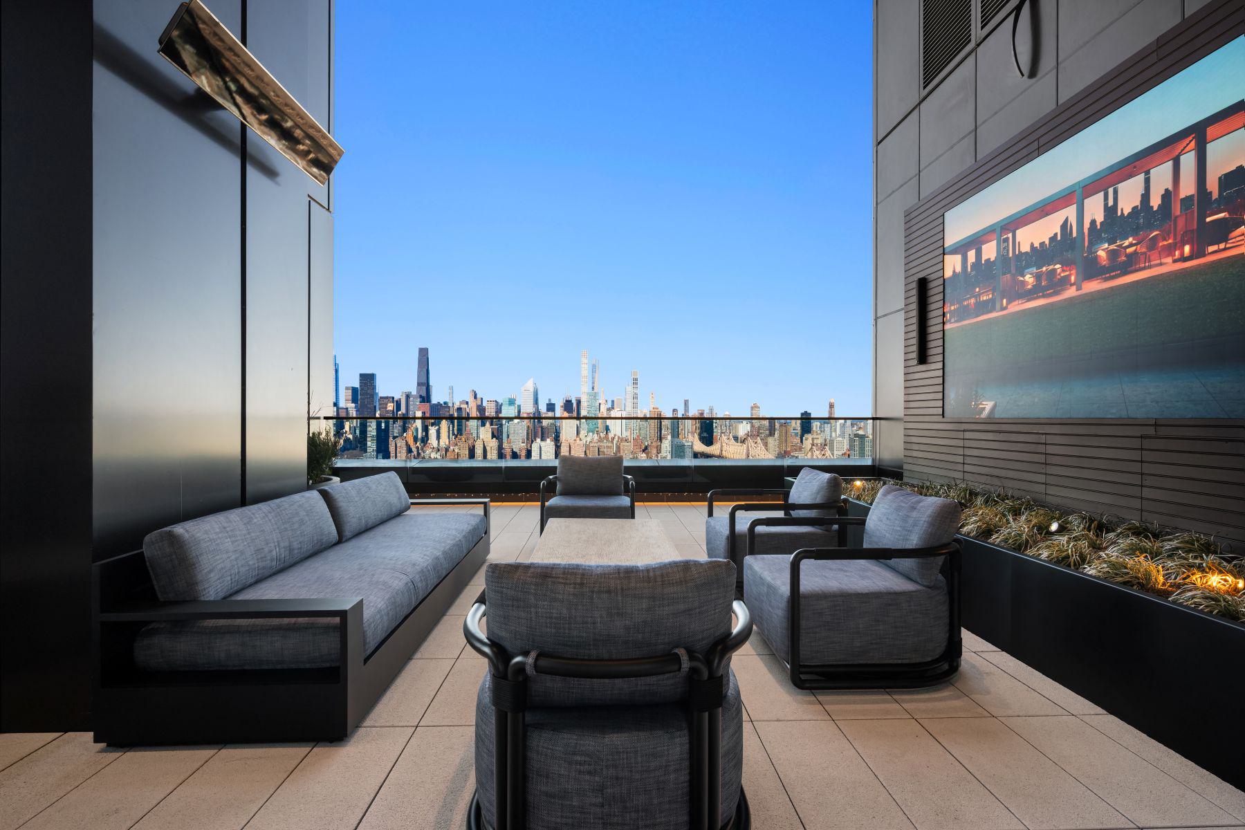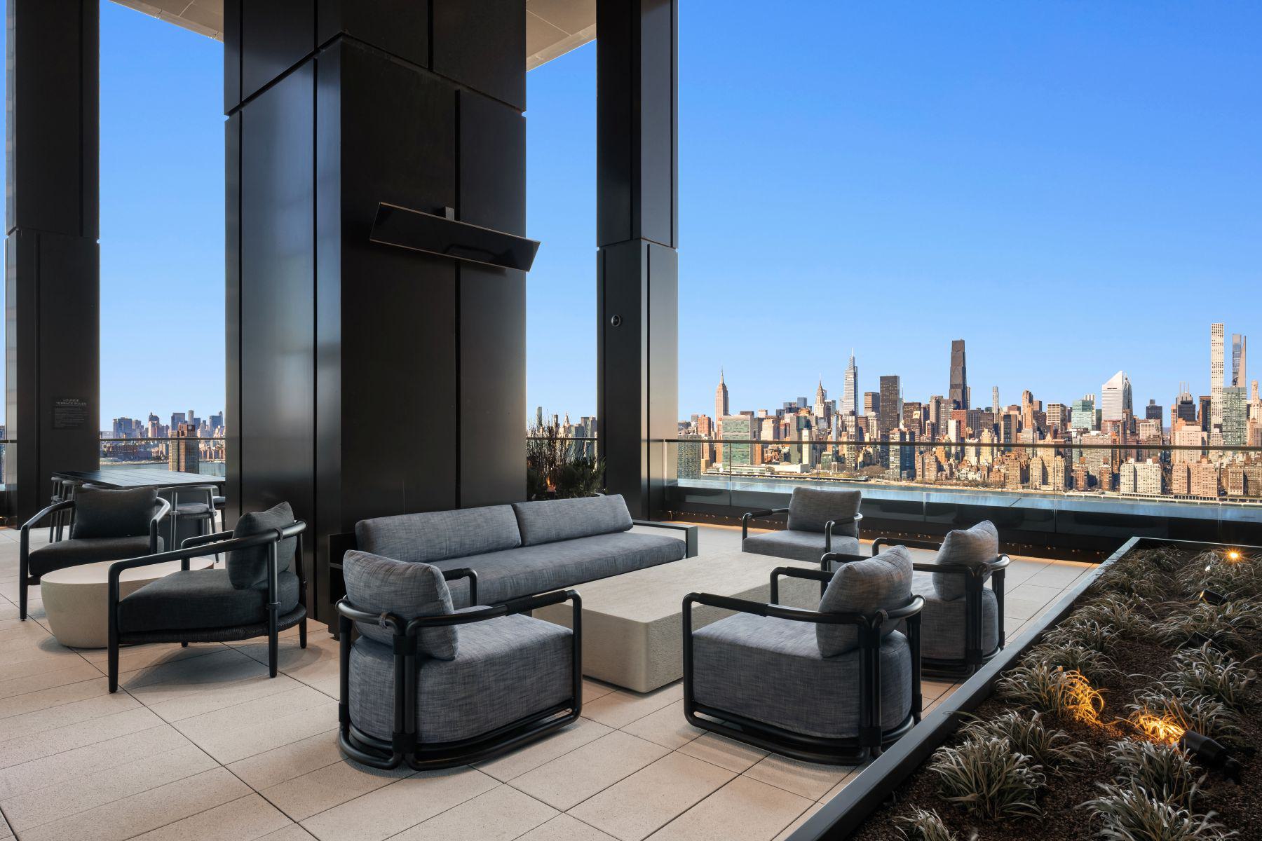 - Amenity terrace on the 66th floor with outdoor grills, seating, and skyline views of Manhattan